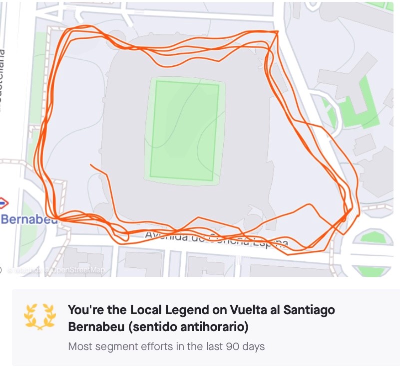 I smiled during every run in the city. I remembered why I enjoy running so much, even when the knee tries to remind me it probably won’t be a long term love affair. But the run that made me smile the most was actually the shortest of the week; laps of the famous Santiago Bernabeu stadium. I jumped on the metro for the 2.5 mile trip north as I didn’t have as much time that morning as the others. As football fans on here will probably know, the stadium is currently undergoing a major refurbishment so I knew before I set off that I’d be turning up to a building site. Even still, I thought it would be cool to say I’d ran round the outside of it. The construction, plus all the roads and the busy pavements around it made it a bit stop start, but it was good fun and I managed a wee glimpse inside the stadium through a gate. And as I uploaded my run to Strava on the tube back (great signal underground) I burst out laughing as it proclaimed me the new LOCAL LEGEND of the Santiago Bernabeu…Anti-clockwise (respect to my clockwise counterpart!). Of all the greats that have graced that stage, it took just four laps and 20 minutes for wee Chicken Legs to earn legendary status!